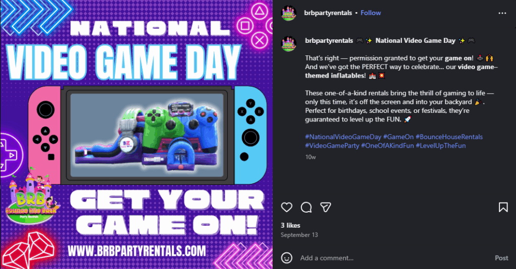 Besides, nearly 50 percent of gamers already engage with user-generated content according to a study by the Entertainment Software Association (ESA), meaning audiences on National Video Game Day are primed to interact rather than just scroll past. For brands, this turns a simple themed post into a real opportunity to spark participation and strengthen long-term loyalty.