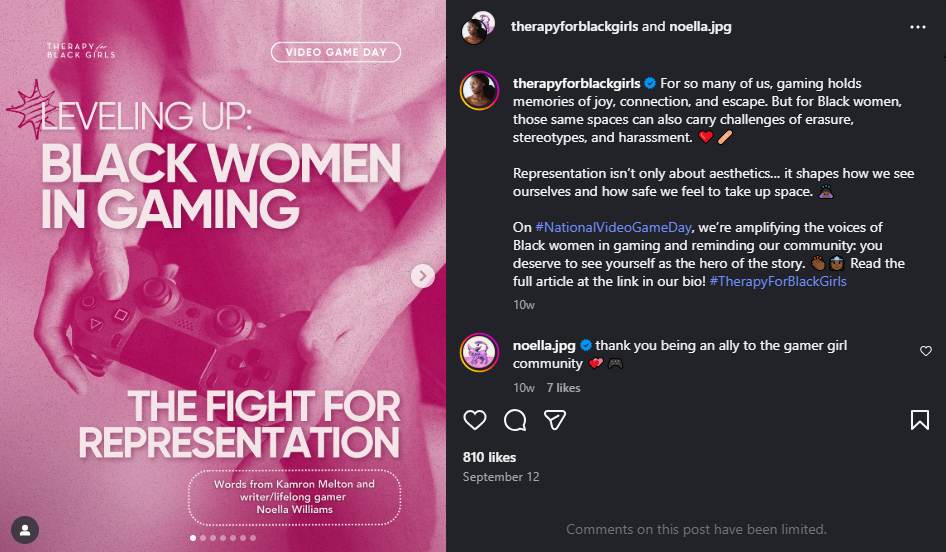 A strong example is how Therapy for Black Girls used the day to shine a light on the Black girl gaming community. Instead of focusing on products or promotions, they used their platform to celebrate representation, belonging, and the joy that Black women and girls bring to gaming culture.
