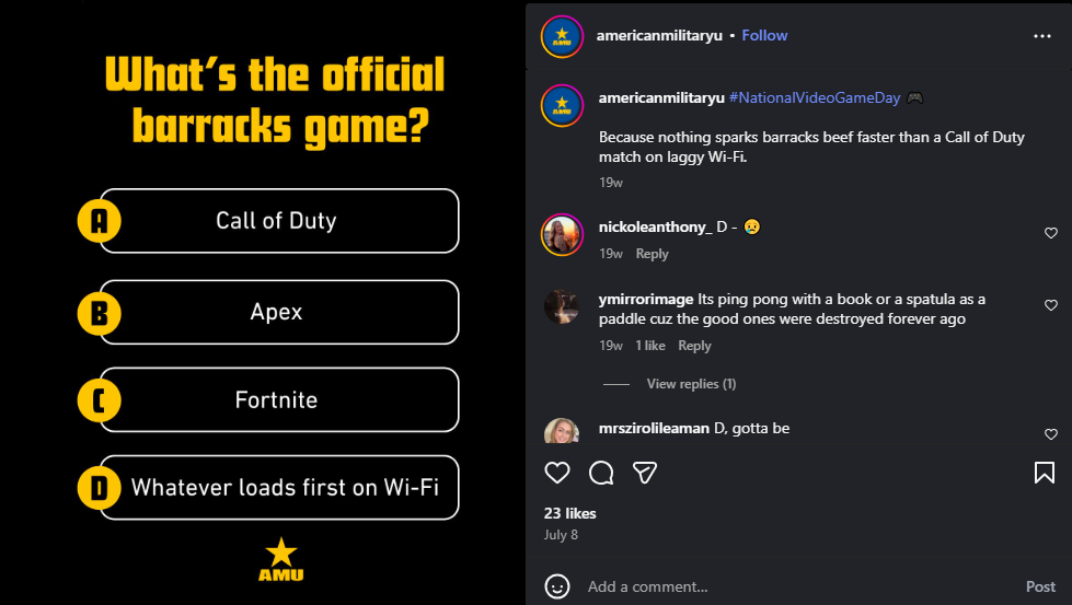 The goal is to make your audience pause, tap, guess, and maybe challenge a friend. Trivia works even if your brand has nothing to do with gaming because it sparks nostalgia and conversation without needing big visuals, new products, or a complex campaign. The American Military University social media team struck the perfect chord by talking about barracks games.
